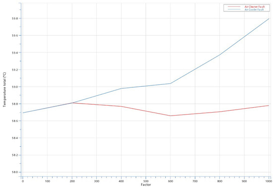 Figure 11 shows the air temperature values measured at the intake manifold within the engine model. The red line shows the air temperature value depending on the degree of air filter clogging, where 0 represents a simulated completely clean filter, while 1000 represents a simulated completely dirty filter. The blue line shows the air temperature value at the intake manifold in the case of simulated air cooler contamination.