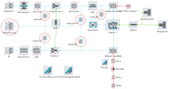 In order to determine the location of the media leak, a simulation is performed in the AVL Cruise M software R2024 by introducing restrictions into the high-speed four-stroke engine model (Figure 12). The restriction represents a narrowed section of the pipe, determined by the cross-sectional area. The leakage factor ranges from 0 (no leakage) to 1 (maximum leakage). The restrictions are set in the following places (red circles in Figure 12): Leak_AF: air filter; Leak_Com: compressor; Leak_IM: intake manifold; Leak_EM: exhaust manifold and Leakage_TU: turbine.
