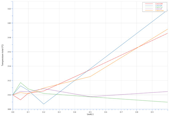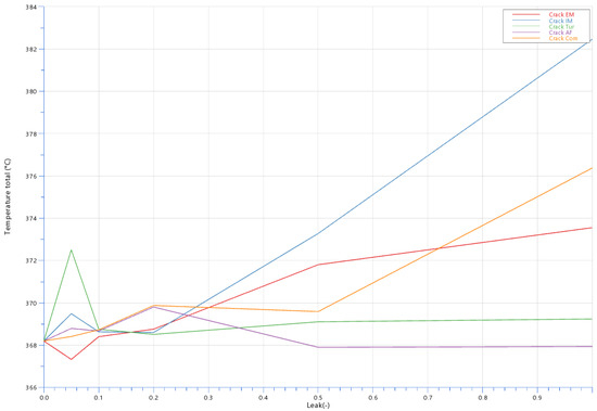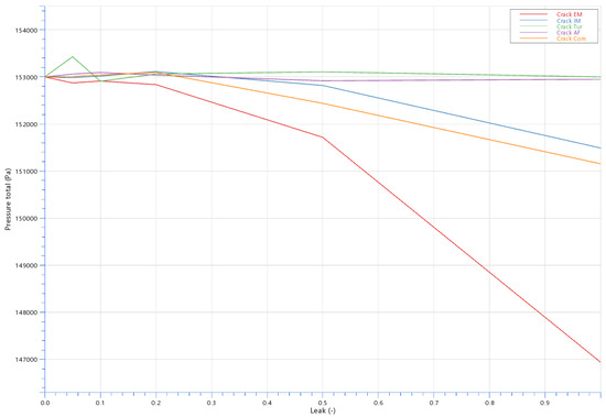 Figure 13, Figure 14, Figure 15 and Figure 16 display the effects of leakages on pressure and temperature at various points. For instance, Figure 13 shows the overlapping pressure values for the compressor and intake manifold leakages, while Figure 14 highlights temperature deviations. Figure 15 and Figure 16 display the influence of leakage on the pressure and temperature measured at the turbine outlet