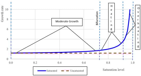 Figure 1 illustrates the saturation paradox—growing productivity (profitability) as the saturation level increases. The theoretical unsaturated growth rate is visualized as a stable line. When the difference in the saturated and unsaturated growth rate becomes significant, a shift from a fundamentally driven investment to expectation-driven speculation occur (bifurcation). Figure 1 visualizes the three stages of market saturation when the growth rate is significant (bifurcation point) and the growth rate starts to increase exponentially (overheating).