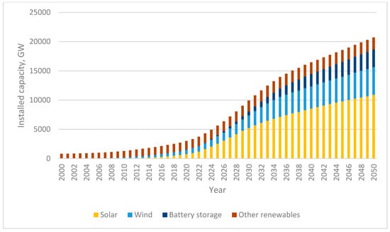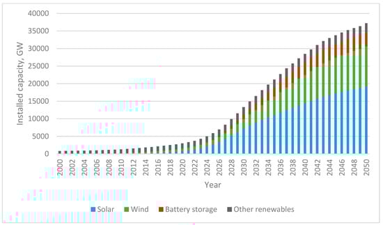 It is necessary to describe the current state of the relevant markets. As illustrated in Figure 2 and Figure 3, there are clear tendencies towards markets’ (sectors’) saturations. Significant growth regarding RE in solar, wind and related battery-storage installed capacity began around 2020–2021. The beginning of the analysis period, precisely at the start of the 2020–2021 energy-source price shock, has driven the development and installation of RES technologies. The research period is defined as 2020–2031 for the medium term and 2020–2050 for the long term. These periods are the most characteristic for logistic growth analysis.