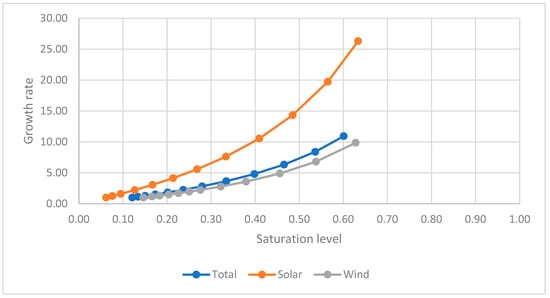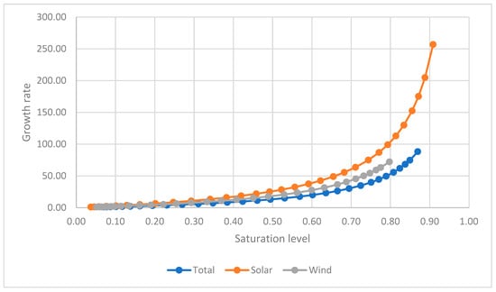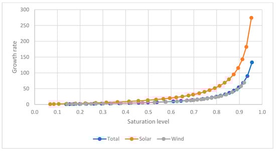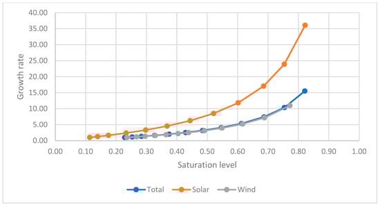 Figure 4 represents the NZS medium-term installed RE saturation and growth rate. In this case, the maximums of solar saturation reached 0.63 and the growth rate 26.29, wind 0.63 and 9.86, and total RE 0.6 and 10.92. The bifurcation point was not reached.