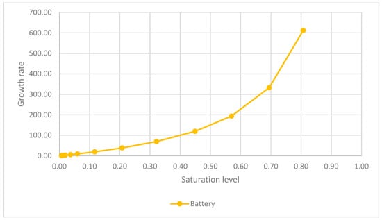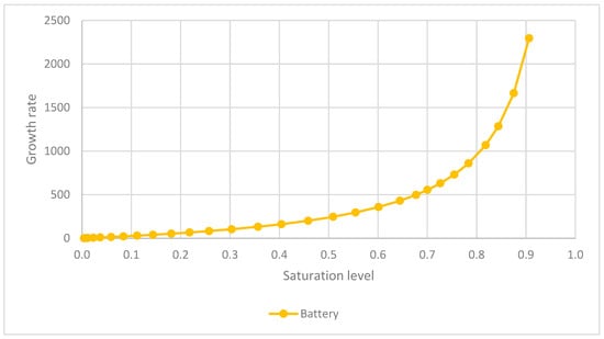 The saturation percentages have revealed an unusual feature—the phenomenon of increasing productivity (profitability), called the saturation paradox. This paradox can be described as follows []: if a population (capital) grows in a determinate environment and saturates that environment when it grows, the growth rate of the population also increases as saturation increases, and this growth is hyperbolic (explosive). When the system’s saturation increases, the system’s productivity increases. When the saturation approaches 100 percent, the productivity of the system starts to increase in a hyperbolic manner. The economic meaning of the saturation paradox can be defined as follows: if capital is invested in a closed (deficit) market and the financial saturation of that market increases, the profitability of the investment rises unrestrictedly.