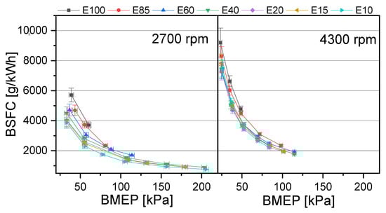 Figure 2 shows the BSFC values obtained in the experimental tests for several bioethanol–gasoline blends with the SI-ICE operating at 2700 and 4300 rpm. As anticipated and consistent with what was reported in the literature [32], the BSFC at both rpm decreases as the BMEP increases. Consequently, the BSFC curves for each blend are organized according to their respective LHV values, meaning that blends with higher energy per unit mass require less fuel mass for the same power output. Therefore, the highest BSFC in the SI-ICE is presented for E100 (blend with the lower LHV), while with E10, the SI-ICE presents the lowest BSFC (blend with the higher LHV).