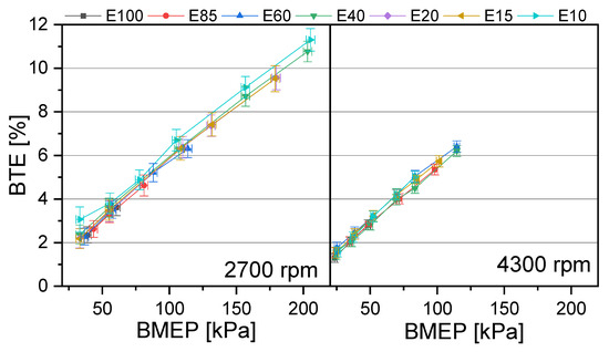 As shown in Figure 3, the better values correspond to the blends that present lower fuel consumption. The overall highest BTE is presented by E10 and the lowest by E100; this aligns with the results obtained for the BSFC. However, the SI-ICE fuelled with E40 displays a BTE comparable to that fuelled with E10, being the second, overall, highest for most of the interval, indicating that a better combustion for E40 leads to a better thermal efficiency than that for E15 or E20, which are blends with a higher LHV and therefore a lower BSFC under this engine speed condition. The BTE results for 4300 rpm are almost half the values obtained for 2700 rpm. This behaviour is expected due to the higher fuel consumption at 4300 rpm.