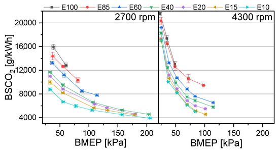 BSCO2 vs. BMEP at 2700 and 4300 rpm of an SI-ICE fuelled with bioethanol–gasoline blends.