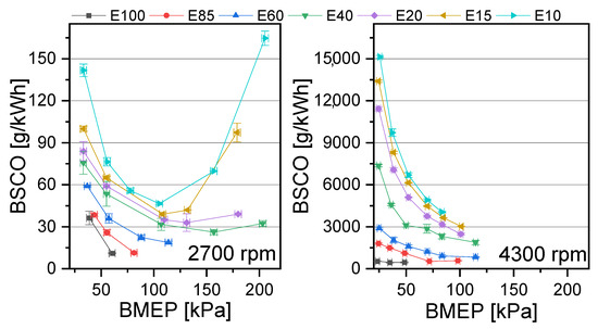 Figure 8 shows the BSHC emissions at 2700 and 4300 rpm. The results show that E10 presents the maximum BSHCs for these engine speeds, and all blends show a decreasing HC behaviour as the engine load increases. Also, it is observed that at 4300 rpm, the engine produces higher values of BSHCs than at 2700 rpm for all blends; as was mentioned before, this behaviour is due to the short time that the air–fuel has to react at 4300 rpm, meaning that not all of the fuel can burn, leading to a rise in the HC emissions. In both cases, the data dispersion of E85 and especially E100 was much higher than that of the other blends, showing a poor combustion process and some instability in the combustion efficiency and, thus, in engine operation.