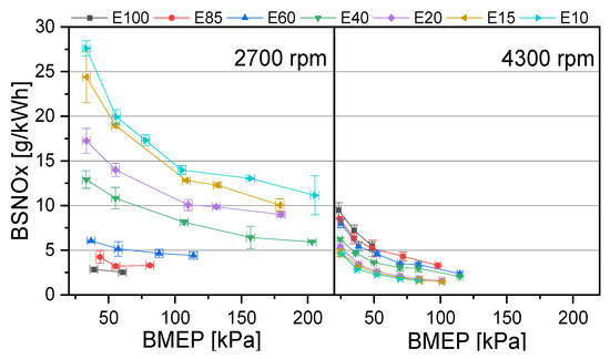 Regarding 4300 rpm, the BSNOx are lower than at 2700 rpm due to the lower engine brake power and poor combustion achieved at this operation point, which leads to lower exhaust gas temperatures (Figure 7). A particular behaviour is highlighted under this condition; all blends’ BSNOx results are reversed, i.e., the highest NOx emission is with blend E100, and the lowest is with blend E10. This behaviour is because the extra oxygen contributed by the blends is not consumed in the combustion process. This leads to a rise in NOx emissions with the increase in bioethanol in the blend.