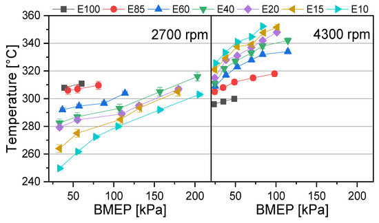 Exhaust gas temperature vs. BMEP at 2700 and 4300 rpm of an SI-ICE fuelled with bioethanol–gasoline blends.