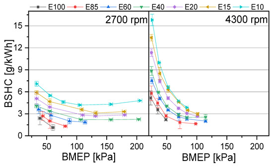 BSHCs vs. BMEP at 2700 and 4300 rpm of an SI-ICE fuelled with bioethanol–gasoline blends.