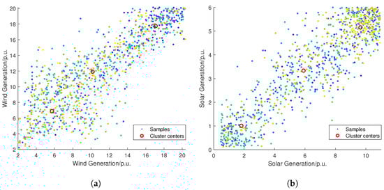The correlation between wind and solar-power generation when geographically close to each other is analyzed in this paper to quantify the uncertainty of REG more accurately. Partial correlation analysis results are demonstrated in Figure 5. In the simulation, 1000 initial scenarios are generated by Gibbs sampling and three of them are selected as typical scenarios according to the distribution of the initial samples using Fuzzy C-Means (FCM) algorithm. The cluster centers are represented by the small red circle. As shown in Figure 5, the typical scenarios can effectively preserve the distribution characteristics of the original samples. The correlations are also quantified using Kendall rank correlation, and the corresponding Kendall’s tau coefficient is demonstrated in Table 2. It can be observed that there is a strong positive correlation between wind-power plants that are geographically close to each other, the Kendall rank correlation coefficient of which is over 0.8. The same is true for photovoltaic power generations that are geographically close to each other. In addition, a weak negative correlation is observed between wind and solar-power generation.