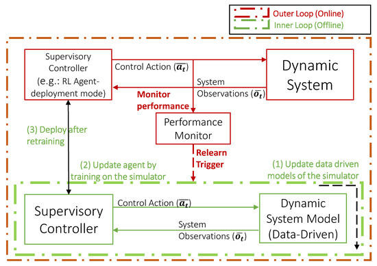 The proposed framework, as depicted in Figure 1, consists of two iterative processes: (i) an Outer loop, where a Performance Monitor assesses the reward per interaction during the deployment phase; and (ii) an Inner Loop that is activated when degradation of system performance attributed to non-stationary changes in system performance leads to relearning the dynamic system model for a new system configuration.