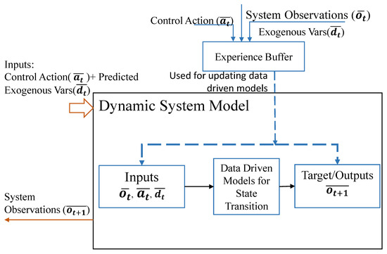 In addition to the models required to simulate the system transition, we propose to develop a set of data-driven models to simulate the future behavior of exogenous variables. We name these the Exogenous Variable Predictors. These models simulate the system behavior into the future, and they help us address the problem of potentially limited data available after a non-stationary change is detected. The derived models are used to relearn the RL controller to make it optimal for the system’s future behavior.