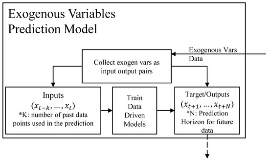 Exogenous variable prediction module. The dashed lines represent any interfacing operation between the component itself and external components. *K and *N represent ideal values for the past and future horizon respectively.