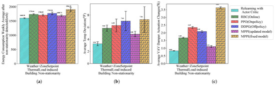 - Deng, X.; Zhang, Y.; Qi, H. Towards optimal HVAC control in non-stationary building environments combining active change detection and deep reinforcement learning. Build. Environ. 2022, 211, 108680. [Google Scholar] [CrossRef]