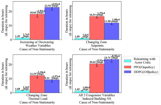 The VAV Damper actuation rate of the relearning framework was also better than the other approaches due to similar reasons as above. This led us to investigate the duration of operation where each of these methods were performing suboptimally. This would provide further inside in to the differences in the behavior. Hence, we compared the time taken to relearn compared to the online algorithms PPO and DDPG in Figure 8. indicates the time it took from the start of the relearning trigger to the time until the controller training converged. We measured this for our approach as well as PPO and DDPG using a callback during the training process that told us whether the episode reward over the last 10 episodes was within 2 standard deviations of the average of the past 100 episode rewards.