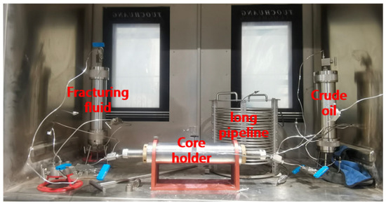 The experimental instruments mainly include the TC-60 gas pressurization device (Tuochuang, Jiangsu, China), TC-300D dual cylinder constant (Tuochuang, Jiangsu, China) speed and pressure pump, TC-V vacuum pressurization saturation device (Tuochuang, Jiangsu, China), HBQT-70 high temperature (Tuochuang, Jiangsu, China) and high-pressure multifunctional core displacement device, ZR-III high temperature and high-pressure intermediate vessel (Tuochuang, Jiangsu, China), MacroMR12-150H-I nuclear magnetic resonance instrument (Niumag, Suzhou, China), high temperature and high-pressure core gripper, D07-CM067 gas mass flowmeter (Tuochuang, Jiangsu, China), etc. The experimental device for the fracturing fluid’s energy storage and efficiency enhancement effect is assembled as shown in Figure 1. The experimental equipment is set up to study the near fracture matrix, with the rock core inlet in contact with the improved fracturing fluid cavity, simulating the contact between the fracture wall and the fracturing fluid. The core outlet end is connected to a 50 mL long thin tube and a 500 mL intermediate container to simulate crude oil in a remote shale reservoir. The long pipeline and intermediate container are filled with formation crude oil to maintain the original formation pressure. The purpose of the long pipeline is to prevent liquid from the core from flowing into the intermediate container, which simulates the contact between the pore fluid and near fracture matrix in shale formations within half-cluster spacing. The experiment was based on a single cluster fracturing section at the field scale, and the liquid ratio in the reservoir state was truly restored. The specific parameters for calculating the ratio of fracturing fluid to crude oil at the field scale and the ratio of fracturing fluid to crude oil at the experimental scale are shown in Table 1. The injection fracture fluid volume at the experimental scale simulates the single-stage fracturing fluid injection volume. The crude oil volume in the holder-embedded experimental core simulates the fluid volume within a 6 cm near-fracture matrix. The crude oil in intermediate containers simulates the far-fracture matrix fluid volume within half-cluster spacing. This experiment reproduces the contact process between the fracturing fluid and near fracture matrix during the well shut-in by using the net pressure inside the fracture as the initial pressure difference (10 MPa), simulating the pressure accumulation process after pump shutdown, and exploring the pressure transmission effect of different fracturing fluids near the fracture matrix.