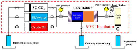 CO2 pre-fracturing corrodes the fracture wall, improves fracture conductivity, effectively replenishes stored formation energy, reduces crude oil flow resistance, and increases the oil recovery rate in oil wells [25,26]. The existing energy storage evaluation experimental methods lack simulation of artificial fracture storage fracturing fluid and remote shale storage crude oil, which cannot reflect the unidirectional pressurized energy storage process under reservoir conditions. The energy storage pressure obtained from the existing experimental conditions is seriously inconsistent with the actual field conditions. Therefore, this article describes the innovative design of an experimental fracturing fluid energy storage process. By improving the existing core holder and adding fracturing fluid cavities and large volume intermediate containers to simulate fracturing artificial fractures and remote shale reservoirs under the conditions of a real oil–water ratio and real pressure distribution (fracturing fluid inside the fracture (16 mL, 40 MPa)—near fracture reservoir liquid (4 mL, 30 MPa)—remote reservoir liquid (244 mL, 30 MPa)), the pressure changes in the core during the well shut-in process are monitored to explore the energy storage law of the fracturing shale reservoir shut-in liquid and to clarify the energy storage effect, optimal CO2 pre-injection, and optimal shut-in time of different fracturing fluids.