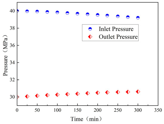 The pressure changes at the inlet and outlet ends of the rock cores under different injection methods are statistically analyzed, indicating the pressure consumption of artificial fractures in contact with the near fracture matrix and the pressure energy storage changes in the remote shale reservoir during the well closure process, as shown in Figure 4. Different injection methods show a decreasing trend at the inlet end of the rock core, while the outlet end first rises and then stabilizes.