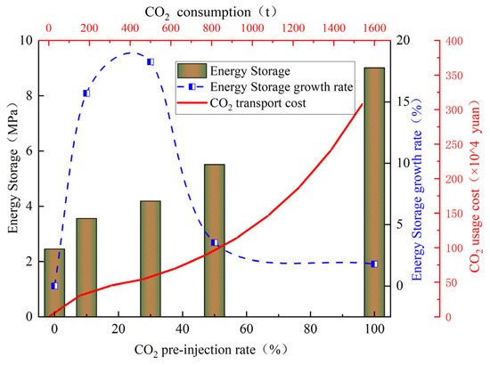The blue curve in Figure 5 represents the calculated energy storage growth rate under different pre-CO2 ratios. The curve shows that the energy storage growth rate reaches its maximum value when the CO2 pre-charge ratio is between 20% and 30%. The red curve in Figure 5 represents the CO2 usage cost under different CO2 usage conditions. From the curve, it can be concluded that, as the CO2 usage increases, the usage cost increases exponentially. Therefore, considering the energy storage pressure, CO2 consumption, CO2 usage coast, and energy storage growth rate, there is an optimal pre-load for CO2, and the experiment’s optimal pre-load range is 20% to 30%. The amount of fracturing fluid used in a single section of the Jimsar shale oil field well is about 2000 m3, and due to factors such as gas sources and transportation costs, the amount of CO2 used is 180 t. Using the volume fraction of 20~30% in this section as the optimal pre-interval for CO2, the optimal usage volume for a single CO2 segment is calculated to be 400 m3~600 m3. Based on a CO2 density of 770 kg/m3 (20 °C), it is recommended to have a single-stage CO2 pre-load of 308 t–462 t on site. The on-site CO2 consumption of the oil well is far beyond the optimal range recommended in this article.