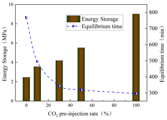 Energy storage pressure and equilibrium time with different CO2 pre-injection ratios.