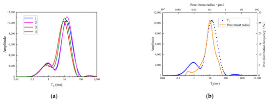 Initial NMR T2 spectra and pore size conversion of experimental rock cores: (a) NMR spectra of saturated crude oil from different rock cores; (b) Pore throat distribution and pore size conversion.