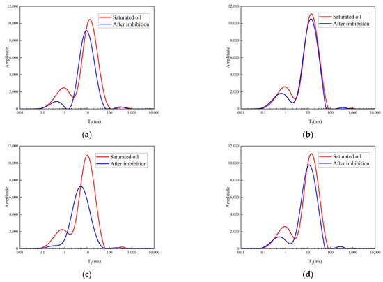T2 NMR spectra of rock cores before and after imbibition under different energy storage methods: (a) T2 spectra changes in J1 rock core in slickwater; (b) T2 spectra changes in J2 rock core in pre-slickwater; (c) T2 spectra changes in J3 rock core in CO2; (d) T2 spectra changes in J4 rock core in pre-CO2.