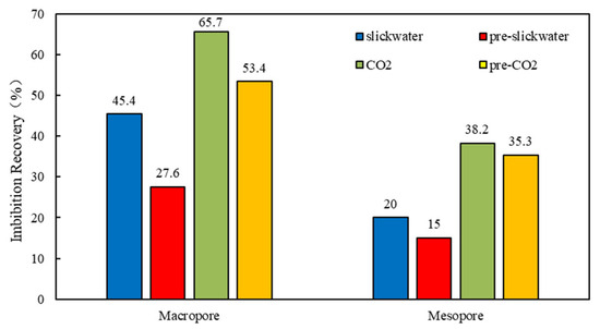 According to Equation (2), we calculate the lower limit of oil containing pore utilization for different rock cores, and the statistical results are shown in Table 5. The core permeability and recovery rate of CO2 series fracturing fluid is about 10% higher than that of the slickwater series, and the lower limit of oil containing pore utilization is lower than that of slickwater. CO2 can enter and utilize smaller oil containing pores. According to Figure 9, the permeability and imbibition recovery of different rock cores with large and macropores are higher than those of the fracturing fluid in the sliding water system. During the energy storage period, CO2 can dissolve into the crude oil to reduce its viscosity, interfacial tension between oil and water, and thus lower the resistance of oil phase seepage. The recovery rate of macropores is significantly higher than that of slickwater. During the energy storage period, CO2 dissolves into the crude oil in the core, reducing the viscosity of the crude oil while increasing fluid pressure. During pressure relief measurement using nuclear magnetic resonance, more large pore crude oil can be utilized, and CO2 energy storage can effectively increase energy and improve core recovery.