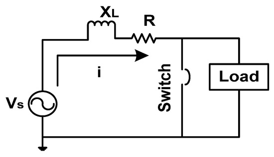 The fault behavior of AC faults is studied using a resistive–inductive (RL)-equivalent circuit, as shown in Figure 2 [39]. The switch initiates a fault and short circuits the load with low impedance, resulting in a high current level from the source. The fault current has an impedance calculated from the circuit using .