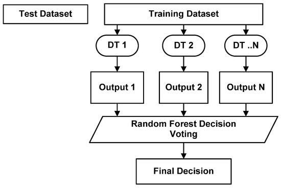 Ensemble models are effective for reducing the overfitting in the decision tree. Being an ensemble model, RF uses a bunch of trees to overcome this issue. RF is an ensemble-based model that uses multiple decision trees. During the process of classification, each tree has an output, and the final classification is based on the majority output decision of the trees. Owing to its high accuracy and generalization performance, an emerging RF ensemble algorithm was investigated for fault protection [41]. Figure 3 shows the flow chart of the working principle of random forest. It reviews the working methodology and how it attains the final output decision based on the voting of multiple trees. The pseudo-code of the RF algorithm is given in Table 1. The scheme considers random samples from the dataset and randomly develops the decision trees. After voting on the decision trees, the tree with the most votes is selected.