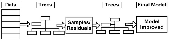 Friedman introduced GB, which is an ensemble learning model for classification and regression. It can produce an effective model consisting of weak learners, such as decision trees. The core idea of GB is to optimize an objective arbitrary loss function to create and generalize the ensemble model in multiple stages [43]. The working principle of GB is described in Figure 4. It depicts how it improves the final output using multiple stages and how data are randomly split across subtrees to minimize the error of the loss function. After several steps, the loss function is minimized. Finally, the improved model is obtained.