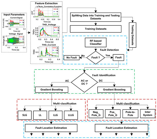 The proposed technique employs the retrieved voltage and current signals. Accordingly, the most sensitive time-domain features are extracted to detect abnormality during faults. The features are selected to ensure all possible fault scenarios in a hybrid transmission line and train the algorithm to assess performance using testing data. The model operates in four stages: (1) detection of a fault, the algorithm is trained on the fault, and no-fault data. The first stage ensures the detection of faults successfully from the transient events, (2) identification of either an AC or DC fault, after fault detection, the fault is identified whether on AC or DC line, (3) classification of the respective fault, after identification of the respective faults is classified either AC or DC and (4) fault location estimation. Finally, the algorithm locates the fault on the line. An overview of the proposed data-driven protection algorithm for a hybrid transmission network is shown in Figure 5.