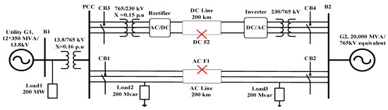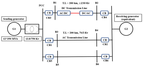 The test system for the proposed protection algorithm was designed in a MATLAB/Simulink environment, as shown in Figure 6. The single-line diagram of the system includes hybrid AC/DC parallel lines on the same tower. The hybrid transmission network consists of two parallel lines, a 765-kV AC line, and a 230-kV DC line, both of which are 200 km long and transfer 3000 MW of power from a generating source of 12 350-MVA generators to a source with a 20-GVA short-circuit level. A 13.8 kV/765 kV Wye-Delta transformer connects the system to the AC transmission line, while a 765 kV/230 kV Wye-Delta transformer connects it to the DC lines. The parameter lines of the models are distributed. The lines are meant to be transposed, with positive and zero-sequence components for the R, L, and C/km parameters. A forced commutated voltage source converter (VSC) connector is utilized in the DC line to transmit power. Three-level neutral-point clamped VSCs with near-insulated-gate bipolar transistor diodes are used in the rectifier and inverter. The proposed hybrid transmission line is shown in Figure 6, and the details are given in Appendix A.
