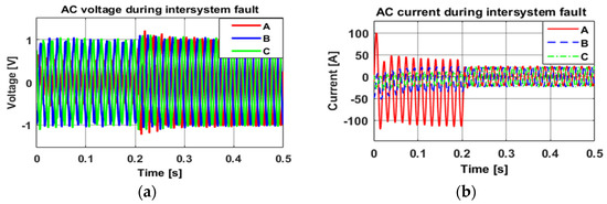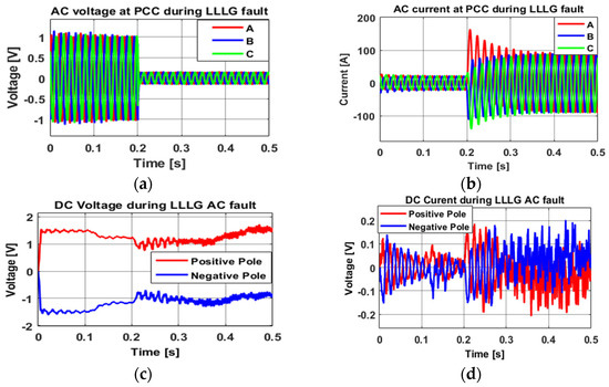 Fault scenarios: (a) the voltage of AC, (b) the current of AC, (c) the voltage of DC, and (d) the current of DC during an LLLG fault in the AC line of the hybrid test system.