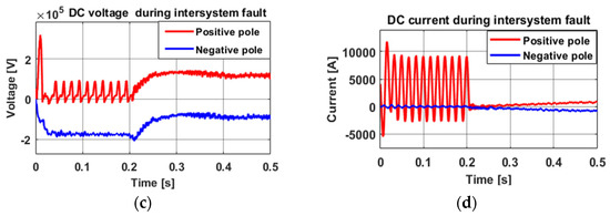 Fault scenarios: (a) the voltage of AC, (b) the current of AC, (c) the voltage of DC, and (d) the current of DC during an intersystem fault in the hybrid test system.