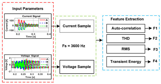 The existing schemes utilize signal processing techniques that need high computation and specific thresholds to detect the faults. To overcome this gap, the proposed approach considers sensitive and feasible time-domain features of hybrid fault scenarios to ensure fault anomaly detection. Accurate and reliable detection of abnormalities requires the careful selection of feature parameters [44]. Hence, time-domain features can provide faster and more accurate protection while reducing complexity. The fault data are collected by variations in fault resistance, fault type, fault inception angle, and location. Conversely, the no-fault scenarios are achieved via abrupt load fluctuations and capacitor switching. After relevant features are extracted, the proposed algorithms are trained for AC, DC, and intersystem faults. Fault duration varies across intervals of 0.2 to 0.25 s. The details of the utilized features are shown in Table 5. Figure 9 provides an overview of the retrieved time-domain features. The standard deviation of selected features is used for data collection to ensure accurate and reliable detection of abnormalities. Feature extraction allows the models to execute their functions, and the sensitive features are selected to ensure a transient nature and irregularity during disturbance. This approach has significantly contributed to the performance of the developed algorithm and promptly detects faults and avoids network blackouts.