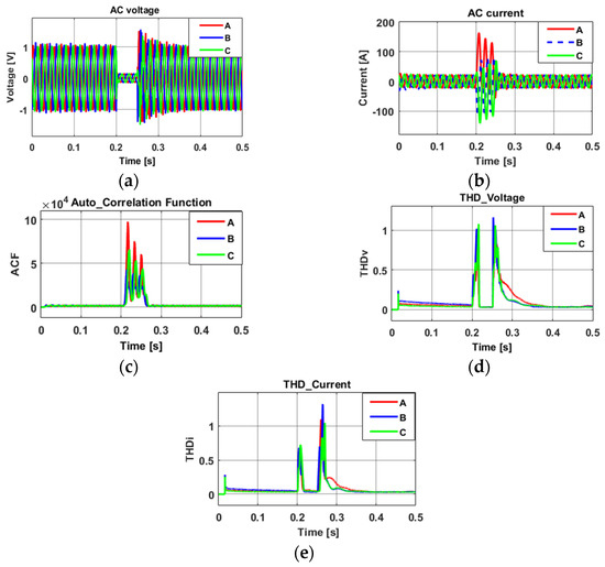 The behaviors of the retrieved voltages and currents are used to identify the distinct features of faults. When faults occur, the defective-phase voltage drops while the current rises in the given fault duration. Accordingly, the selected features of the faulty phase vary compared with those of the healthy phases; therefore, according to these variations, it is easy to identify the faults. Owing to space limitations, only a few feature results are shown below. We investigated three types (AC, DC, and intersystem) of faults in the given test system. The voltage and current data retrieved from the given faults are shown in Figure 10a,b, and the extracted features (autocorrelation and THD) of the voltage and current are shown in Figure 10c–e, indicating the abnormality during the fault periods of 0.2 to 0.25 s. The faults due to the mutual interaction of AC and DC lines are called intersystem faults. The considered scenario of the fault is from the DC line to the AC line. The voltage, current, and extracted features during intersystem faults are shown in Figure 11. Signal distortion due to the nonlinear characteristics of the converters, complex control systems, and mutual interaction of the AC and DC lines are observed.