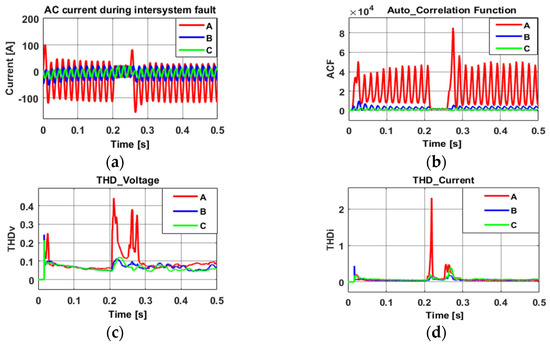 Intersystem fault scenarios: (a) AC current, (b) ACF of current, (c) THDv, and (d) THDi during intersystem fault.