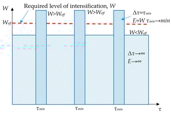 For a continuous energy input, with W < Weff, the required level of intensification is not achieved even at infinitely large energy inputs. For a pulsed energy input, with W ≥ Weff, the required level of intensification is achieved in a short time with minimum energy input.