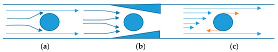 Schematic representation of the factors that provide the relative motion of a dispersed particle in the flow: (a) abrupt acceleration or deceleration with the flow in channels of constant cross-section, ∂v/∂τ ≠ 0; ∂v/∂x = 0; (b) widening or narrowing of the channel cross-section, ∂v/∂τ = 0; ∂v/∂x ≠ 0; (c) action of tensile stresses in shear flows.