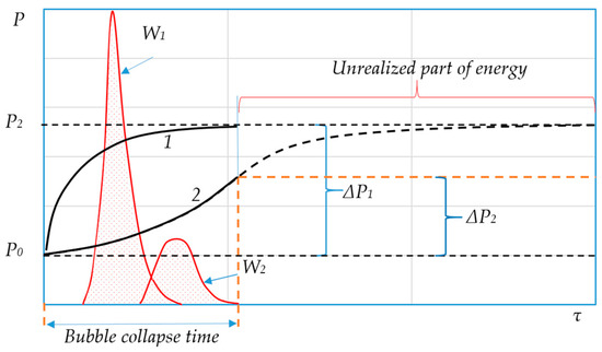 The high level of kinetic energy during the dynamic development of the bubbles is achieved to a large extent by changing the internal energy of the system itself, and this fact makes it possible to significantly reduce the total energy consumption. The savings are even more significant when the accumulation of internal energy is conditioned by the requirements of a particular technology. For example, heating a liquid mixture to sterilise it increases the internal energy, which is converted into kinetic energy in the form of micro-streams during intensive bubble growth due to pressure relief. The theoretical analysis and practical application of the idea of local energy input show that one of the most important criteria for its efficiency is the fastest possible change in external pressure in the system, dp/dτ = d2Epot/(dVdτ) [140,141]. If this condition is fulfilled, the most complete and rational transformation of internal energy can be achieved.