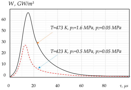 A sudden decrease in pressure within a liquid subjected to extremely high pressure and heated to saturation temperature results in a phenomenon known as explosive boiling, accompanied by an intense growth of vapour bubbles [168,169,170,171]. Although the mechanical energy released during explosive boiling is several orders of magnitude lower than that characteristic of chemical explosions, the destructive potential of such a process is quite significant. In the initial stage of bubble growth, the bubbles can emit pressure pulses of the same intensity as collapsing cavitation bubbles [172,173,174]. Although the mechanical energy released in the process of explosive boiling is several orders of magnitude lower than the energy characteristic of explosions of a chemical nature, the destructive potential of such a process is quite large. At the initial stage of growth, bubbles can emit pressure pulses of the same intensity as cavitation bubbles at the moment of collapse [175,176,177,178].