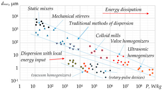 where the coefficient C ≈ 1. In accordance with the concept of local isotropic turbulence, to increase the level of intensification, it is necessary to achieve maximum values of pulsation velocities, v′, and the most effective intensifying effect should be expected in those zones where the greatest power dissipation is observed. Therefore, the reserves for increasing the efficiency of the apparatuses are associated with methods that allow us to maximise the parameters v′ and Wm: increasing the flow velocity in the pipelines, increasing the speed of rotation of the agitator, increasing the roughness of the walls, and using various kinds of baffles, diaphragms, and turbulence grids. All these techniques are used to a greater or lesser extent in improving the operation of traditional apparatuses, and each of them contributes to the achievement of the set goal—to increase the level of intensification by increasing the dissipation of power in the local zone [101,102,103,104,105,106,107]. However, any increase in the value of Wm in the apparatus requires an additional increase in the input power and, consequently, leads to a decrease in its efficiency, since the main part of energy is not spent on useful work in the vicinity of dispersions but is unproductively dissipated in the volume of the continuous phase and on the walls of the apparatus.