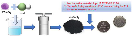 A metal zinc sheet was used as the negative electrode. Prior to assembly, the zinc sheets were mechanically polished with 2000-grit sandpaper to remove surface oxides and impurities, ensuring a clean electrochemical interface. Glass fiber was used as the diaphragm, and 2 M ZnSO4 or 2 M ZnSO4 + 0.2 M MnSO4 was used as the electrolyte. The coin cells (CR 2032) were sealed by a hydraulic crimping machine to finalize their assembly (MTI, MSK-110). The specific preparation process of electrode materials is shown in Figure 1.
