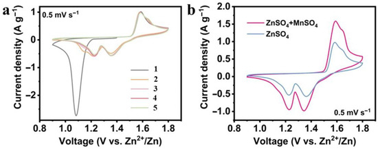 To overcome these problems, researchers have proposed a variety of optimization strategies, such as nano-sizing, doping, and composite material design, aiming to improve the conductivity, rate performance, and cycle stability of MnO2 [27,28,29]. Although these methods have made some progress, the problems of manganese dissolution and phase change still exist and new solutions are urgently needed. Recent advances in hybrid energy storage systems and interfacial engineering strategies further highlight the importance of synergistic material design. For instance, innovative surface protection layers, such as tellurium nanobelt coatings on zinc anodes, have demonstrated remarkable suppression of dendrite growth and side reactions [30]. This approach underscores the critical role of interface optimization in balancing ion transport and structural stability—principles that can be extended to cathode material engineering. Building on these insights, studies have found that adding an appropriate amount of manganese ions (such as MnSO4) to the electrolyte can effectively inhibit manganese dissolution and improve the battery’s cycle stability and capacity retention rate [31,32]. This strategy significantly improves the overall performance of the battery by optimizing the manganese ion concentration in the electrolyte and changing the reaction balance between the electrode and the electrolyte [33]. However, the influence mechanism of MnSO4 on manganese-based oxide cathode materials has not been fully elucidated, and related research still needs to be further explored.