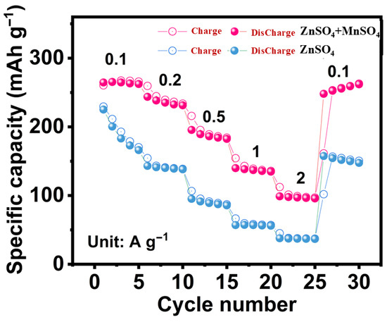 Figure 5 shows the battery rate performance comparison curves of α-MnO2 samples under different electrolyte conditions, and analyzes in detail the significant effect of Mn2+ addition on the performance of zinc-ion batteries. Experiments show that the discharge-specific capacity of the α-MnO2 electrode at current densities of 0.1, 0.2, 0.5, 1, and 2 A g−1 are 172.9, 139.1, 87.3, 56.3 and 37.0 mAh g−1, respectively. After cycling at a high current density (2 A g−1), when the current density is restored to 0.1 A g−1, the discharge-specific capacity can be restored to 150.0 mAh g−1, accounting for 86.8% of the initial capacity, showing a good rate capability, performance, and cycle stability. When Mn2+ is pre-added to the ZnSO4 electrolyte, the rate performance of the zinc-ion battery is further improved. In the electrolyte containing Mn2+, the discharge-specific capacity of the α-MnO2 electrode at the same current density reached 263.2, 232.6, 184.2, 135.7, and 96.5 mAh g−1, respectively, with a rate of 36.7%. After high-rate cycling, when the current density is restored to 0.1 A g−1, the reversible specific capacity can be restored to 259.0 mAh g−1, which is significantly higher than that of the system without Mn2+ addition, showing excellent reversibility and higher capacity utilization.