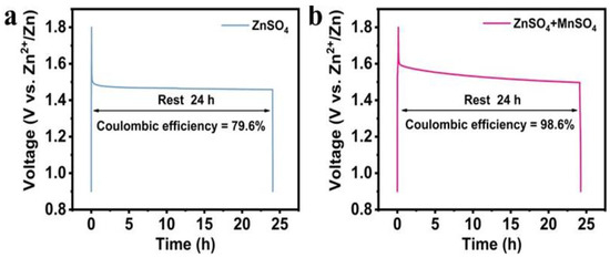 Figure 6 shows the comparison of the self-discharge performance of α-MnO2 samples in different electrolytes. As shown in Figure 6a, the voltage of the battery using ZnSO4 electrolyte dropped significantly after standing for 24 h, and the Coulombic efficiency was only 79.6%. This indicates that, in pure ZnSO4 electrolyte, the battery has a higher self-discharge rate, which may be caused by side reactions in the solution or spontaneous reactions of the active materials. In contrast, Figure 6b shows the self-discharge performance of the cell assembled in a mixed electrolyte of ZnSO4 and MnSO4. The results showed that during the 24 h static period, the battery’s voltage remained relatively stable and the Coulombic efficiency increased significantly to 98.6%. This result indicates that the addition of MnSO4 significantly reduces the self-discharge rate of the battery, which may be achieved by stabilizing the electrode surface reaction or exerting the synergistic effect of manganese ions in the solution. This effect effectively suppresses the unfavorable self-discharge process and significantly improves the electrochemical stability of the battery.
