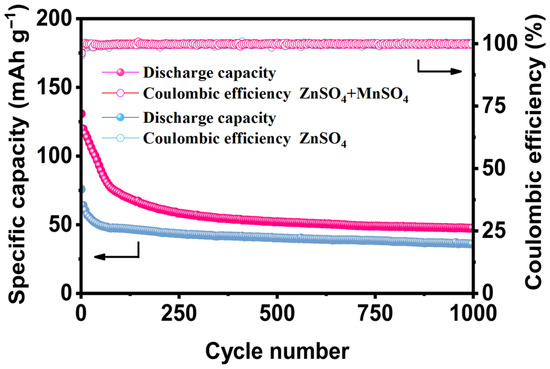 Figure 7 shows the constant current charge and discharge test of the α-MnO2 sample in the voltage range of 0.9~1.8 V and a current density of 1 A g−1. As can be seen from Figure 7, the battery using the mixed electrolyte (ZnSO4 + MnSO4) exhibits a higher discharge-specific capacity in the initial stage, which has a significant advantage over the battery using the pure ZnSO4 electrolyte. In the early stage of the cycle, the specific capacity of the pure ZnSO4 electrolyte system decreases rapidly, while the capacity decay of the mixed electrolyte system is relatively gradual. After 1000 cycles, the battery capacity retention rates of pure ZnSO4 electrolyte and mixed electrolyte are 36.2% and 47.4%, respectively. In addition, the Coulombic efficiency of all systems remains above 98% during the entire cycle, indicating the high reversibility of α-MnO2 materials.