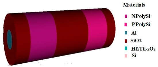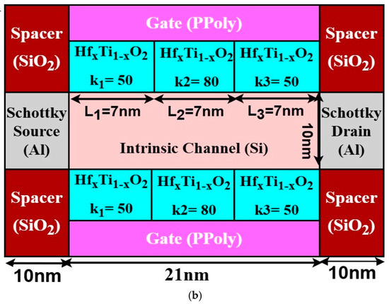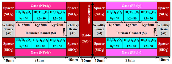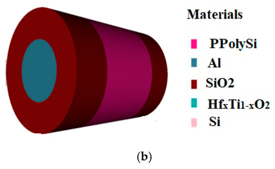 Using the COGENDA TCAD simulator, the following devices with a channel length of 21 nm were created: (1) ‘Device-I’, i.e., an N-Channel HD-SM-GAA MOSFET (radius 5 nm); (2) ‘Device-II’, i.e., a P-Channel HD-SM-GAA MOSFET of 5 nm radius; and (3) ‘Device-III’, i.e., a P-Channel HD-SM-GAA MOSFET of 8 nm radius. The design specifications used for the proposed structures are shown in Table 1. The design parameters of GAA transistors were selected according to Intel dimensions [23]. Figure 1 shows the 2D structures of the proposed devices (a) ‘Device-I’ and (b) ‘Device-II’ of 5 nm radius, 21 nm channel length (L1 = 7 nm + L2 = 7 nm + L3 = 7 nm), and tunable compound (high-k) gate dielectric HfxTi1−xO2 material (k1 = 50, k2 = 80, and k3 = 50). The amalgamation of two oxide materials (HfO2 and TiO2) was chosen to increase the permittivity value to greater than 50. The potential of an insulator is increased by a greater dielectric constant value. Chemical vapor deposition (CVD) is often used to deposit the chosen compound dielectric material, such as HfxTi1−xO2 film, on silicon at temperatures as high as 1000 °C. Unwavering coverage over intricate layouts and fast, flexible growth rates are two benefits of the CVD process [24]. Leakage current and static power consumption are greatly reduced using the high-k gate dielectric because it increases gate capacitance in the structure [22]. Schottky source/drain regions made with aluminum metal and spacer regions and developed with silicon dioxide (SiO2) provide low parasitic effects in proposed devices [25,26].