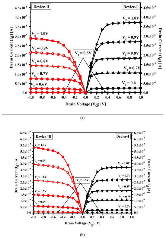 Output curves of (a) ‘Device-I’ and ‘Device-II’ and (b) ‘Device-I’ and ‘Device-III’ at different gate voltage (Vg) and drain voltage (Vd) values from −1.0 V to 1.0 V for 21 nm channel length.